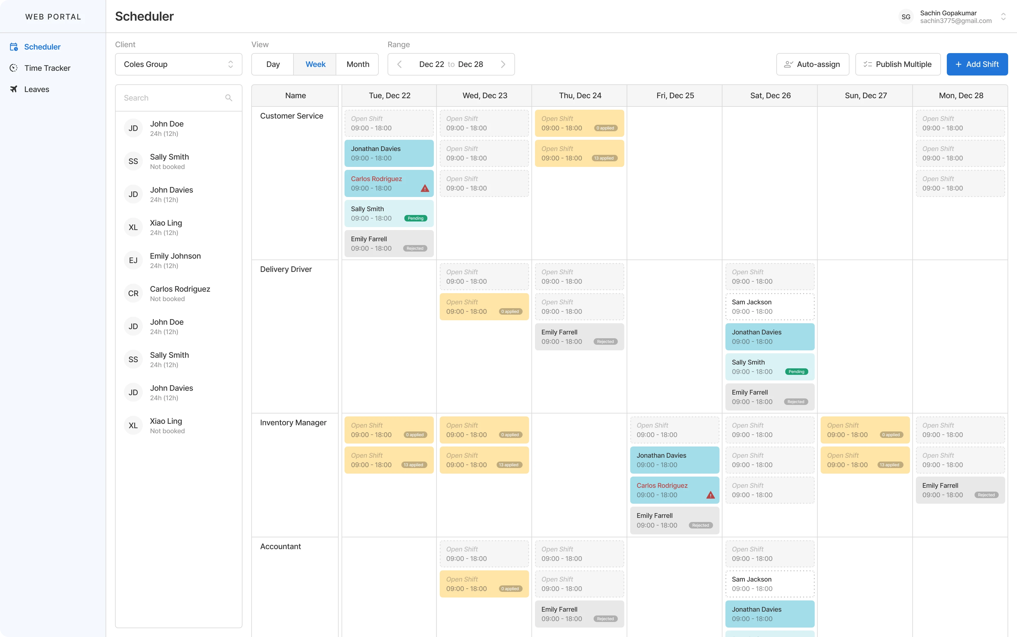 Shifts are managed in the scheduler. Users can go through dates to view various shifts, create new shifts and see who's available to work.